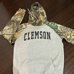 Colosseum men's hoodie with bold Clemson print. Features gray body and camouflage sleeves. Ideal for casual wear.