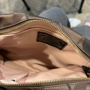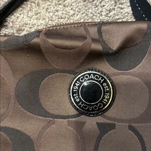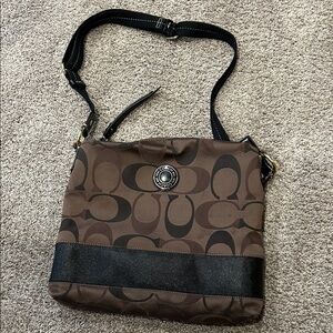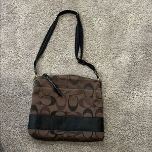 Elegant brown shoulder bag featuring a unique pattern and black strap. Perfect for everyday use.