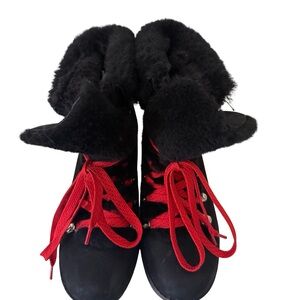 - Color: Black Leather; Black Shearling Trim; Interchangeable Black and Red Laces.