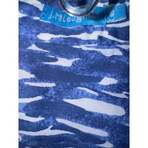 J. McLaughlin Arissa Shirtdress in a blue and white geometric pattern. It is a collared, short-sleeve tunic-style dress with a casual design. The dress appears to be made of a woven fabric and has a button-down front.