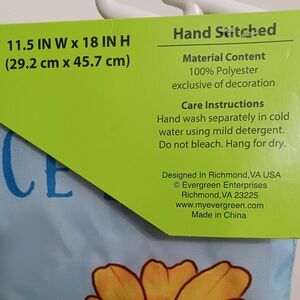 Its 18" x 11.5", and is 100% polyester- made from recycled material. Handstitched, by a woman owned company!