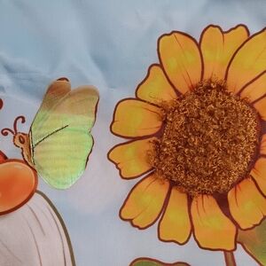 charming flag with an image of a gnome, butterflies, and flowers with the words "No Place Like Gnome". Same design on both sides. On each side, one butterfly has reflective 3d wings, one flower has a 3d, textured center, and the word Gnome is embroidered.