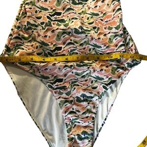 This is a Scotch & Soda all over pastel print open back one piece swimsuit. It’s got triangle cups and a high cut thigh. It ties in the back. It’s size S and in excellent condition.