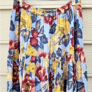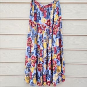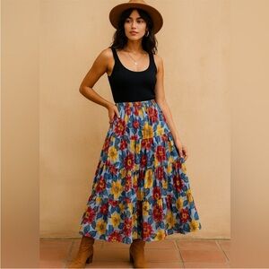 Authentic vintage 90s Cactus Flower floral maxi skirt with bold painterly print in red, blue, and yellow tones. Lightweight 100% rayon with beautiful movement and classic broomstick pleating.