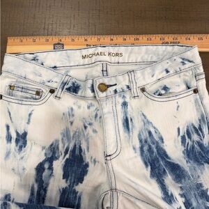 Stylish straight leg jeans with a striking tie-dye pattern. Perfect for a trendy look. Measurements pictured.