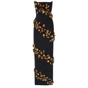 Chic strapless dress by Carolina Herrera. Adorned with gold floral designs on a black base. Ideal for elegant events.