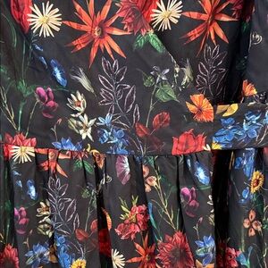 Chic black midi dress with vibrant floral pattern. Features a stylish V-neck and puff sleeves. Ideal for versatile wear. True wrap dress with pockets!