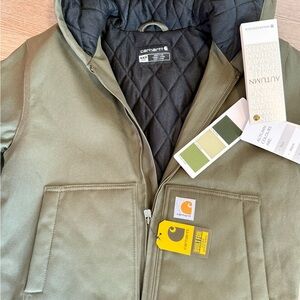 Durable Carhartt jacket in olive green. Includes a hood, front zipper, and two pockets. NWT. Smoke free home.