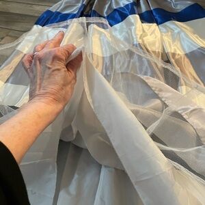 3/4. Stripes - blue, grey, white, black. Back has Zipper with hook for closure, has internal lining and organza lining as well for fluffs, two side pockets.