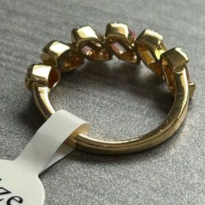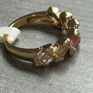 Add a pop of color to your stack! This NWOT yellow gold filled band ring features a gorgeous row of multicolor baguette-cut CZ stones, accented with sparkling clear CZ details for extra shine. It’s giving luxury vibes and looks stunning worn alone or stacked with other rings.