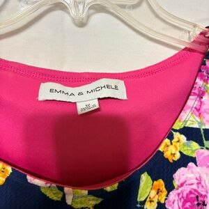 Emma & Michele floral cap-sleeve dress on a navy blue/white striped background.