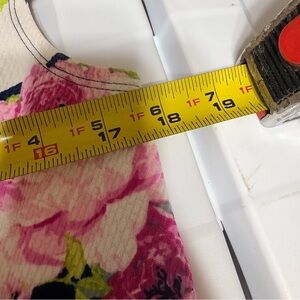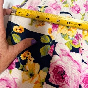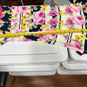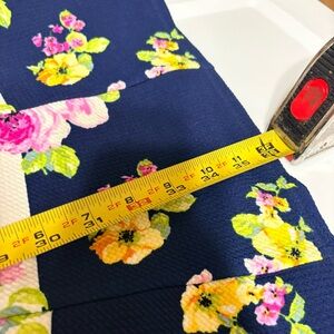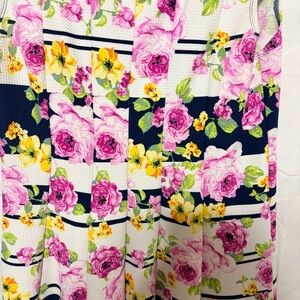 Color/Pattern: Multicolor floral (pink, yellow, green) over navy blue and white horizontal stripes.