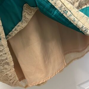 Ryu Anthologie lace detailed A-line dress, size Large, emerald green/ cream, wide straps, back zipper, scoop neck, fully lined, above knee length