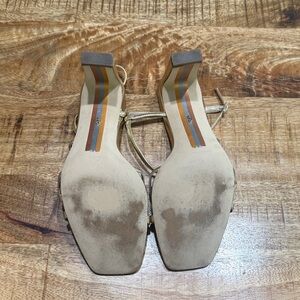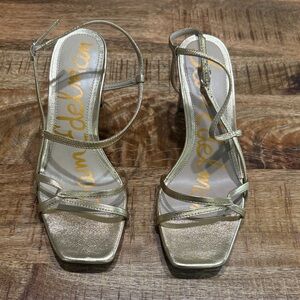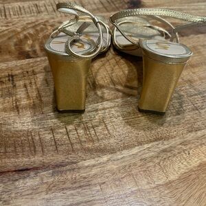 Chic metallic leather gold heels with elegant straps. The Emmie features a chic strappy design and sturdy block heel. Worn once for a wedding. Dust bag included. Perfect for stylish outings.