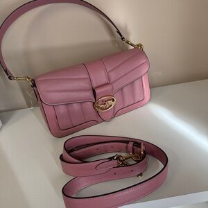 Elegant pink leather shoulder bag with gold accents. Perfect for any occasion. Bottom long 26cm.