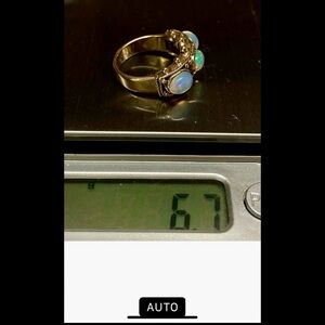 This matching triple opal ring features 3 vibrant opal stones set in a luxurious gold band. Lots of blues pinks and green from these perfectly matched opals.Golden beading on sides of the ring.This is a vintage piece from the late 70’s Hefty gram weight.Will go with so many things.. Perfect for adding a touch of elegance to any outfit. Velvet gift box included.Marked 14k inside ring hard to photograph . Will be authenticated by Poshmark.