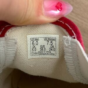 Vans platform slip-on sneakers in vibrant red and pink. Features a classic checkered pattern along the sole. Size = 7.5W, 6M