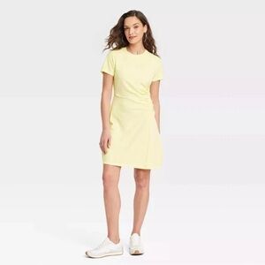 Dress up for casual outings in comfort and style with this yellow Short-Sleeve Ruched Knit Mini T-Shirt Dress from Universal Thread™. This short-sleeve T-shirt dress tailored in a mini length features a casual crewneck and ruching at one side for added style. The lightweight jersey fabric with stretch fabric offers a comfortable drape, while the pullover style makes it easy to wear. Pair with your choice of footwear to complete the look.