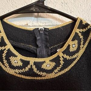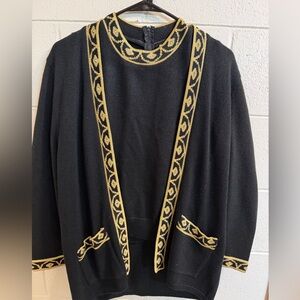 San Remo by Laura Knits vintage sweater set is a black knit coordinate featuring distinctive gold metallic trim. These sets often include multiple matching pieces, such as a cardigan, a tank or mock neck top, and sometimes elastic-waist pants.