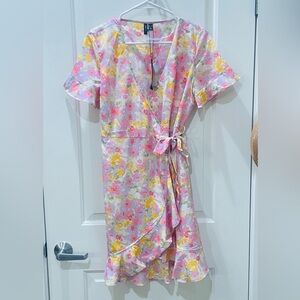 NWT…Super cute and Chic floral wrap dress with ruffle hem. Features pink, yellow, and green hues.