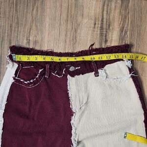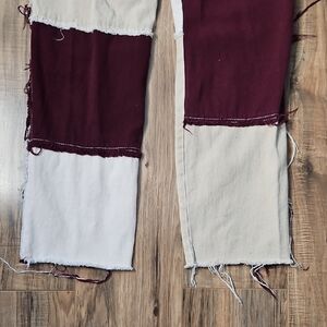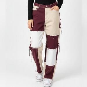 Stylish colorblock patchwork jeans for a bold look. Features a unique blend of burgundy, cream/white, tan. Perfect for making a fashion statement. T6