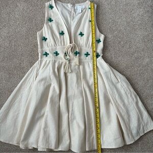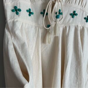 NEW without tags adorable linen blend flowy mini dress by House of Harlow 1960. Beautiful green/turqouise beading on the top that looks like flowers. Features deep v and ties with tassels in the front. Zipper in back. Cotton lining underneath that is a bit more fitted under the flowy outer dress. Perfect boho look for spring or summer!