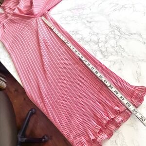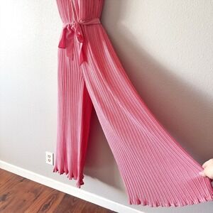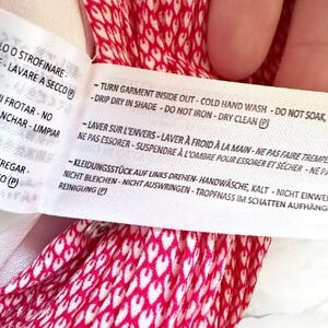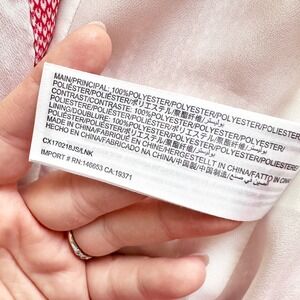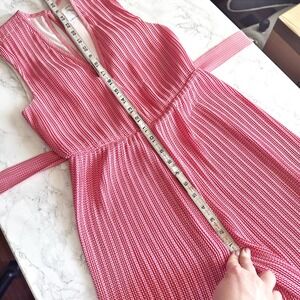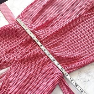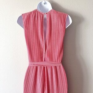 Red and white leaf like woven micro pattern on a all-over micro-pleated body with lettuce hems and a surplice neckline with hook and eye closure. Self tie belt to define the waist. Back has large keyhole button and zip closure. Lined. Very flowy, great movement. Does not come with shoulder ties.