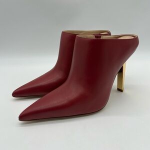 Elevate your look with these stunning Michael Michael Kors Halle Mule Pumps in a rich Deep Red. Crafted from genuine leather with a sleek pointed toe and a high-shine gold sculpted heel, these mules bring modern sophistication to any outfit.