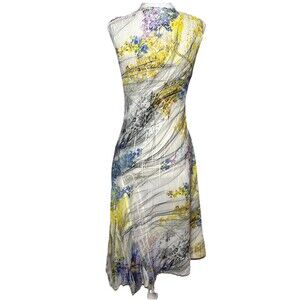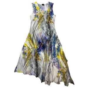 Elevate your wardrobe with this stunning KOMAROV womens size XS dress, featuring a signature crinkled pleated design with a flowy asymmetrical hemline. The dress showcases a whimsical watercolor floral print in shades of yellow, blue, lavender, and ivory, giving it an ethereal, fairycore-inspired look perfect for special occasions, garden parties, or elegant evenings out.