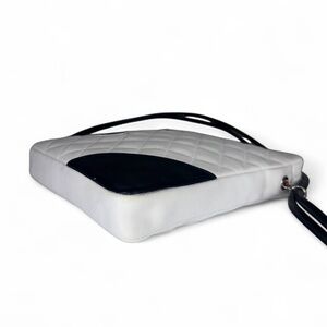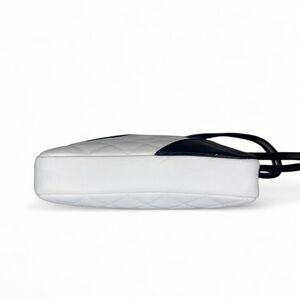 Elevate your style with this iconic CHANEL Cambon Line Shoulder Bag, a chic and timeless accessory crafted from luxurious white quilted calfskin leather accented with striking black leather details. This standout piece from CHANEL’s coveted Cambon collection features the brand’s signature oversized black CC logo appliqué and a contrasting black rolled leather shoulder strap for a bold, graphic look.