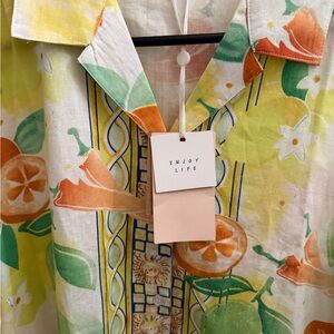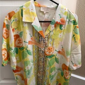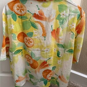Brighten your day with this vibrant citrus print button down shirt. Featuring lively shades of orange, yellow, and green, it's perfect for casual wear.