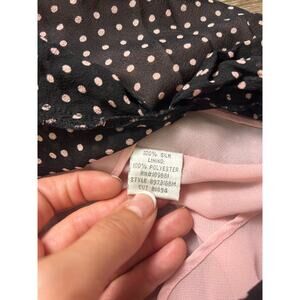 Chic vintage silk mini dress by Donna Ricco featuring playful polka dots and a romantic ruffled cowl neckline 🤍🖤