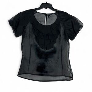 Stylish sheer blouse with layered ruffles. Ideal for any occasion.