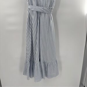Stylish maxi dress with blue and white stripes. Features a wrap design and ruffled hem. Perfect for casual outings.