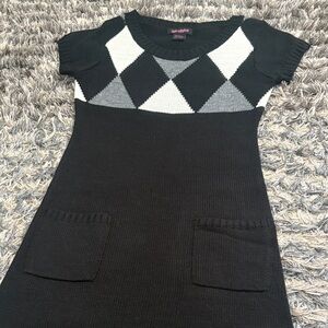 Stylish black and gray argyle sweater dress with short sleeves and front pockets. Perfect for a chic look.