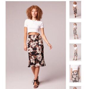 Band Of Gypsies Womans size XL Magnolia Floral Midi Skirt Pull on Lined Black fully lined midi skirt all over floral print black background multicolored shimmery floral A-line boho NEW with tags