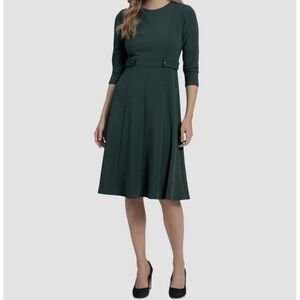 The NWT London Times Women's Side Tab Fit & Flare Dress in Size 16 offers a chic and stylish option for various occasions such as parties, casual outings, or business events. Featuring a flattering fit and flare silhouette, this dress has long sleeves, a round neckline, and a convenient zip closure. Made of polyester and spandex, the dress is machine washable for easy care. With a stunning emerald color and a midi length, this dress by London Times is a versatile and fashionable choice for the summer and spring seasons.