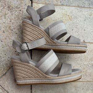 Chic Toms wedges with a woven strap design. Purchased new for my own personal use. Worn just a few times. Very good condition with minimal signs of wear.