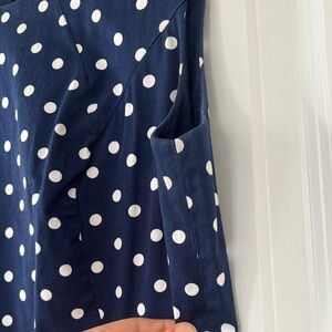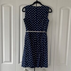 Elegant classic 50’s style navy midi dress with white polka dots. Includes a matching white belt for a tailored look. In great condition. Size six. Has an under layer.