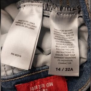 Classic Lucky Brand "Sweet Mid Rise Boot" jeans in a versatile medium wash. These jeans are designed for comfort with a soft, stretchy denim blend. Features a traditional 5-pocket design, zip fly, and the iconic Lucky Brand red clover tag. These are a great "bread and butter" staple for any closet.
