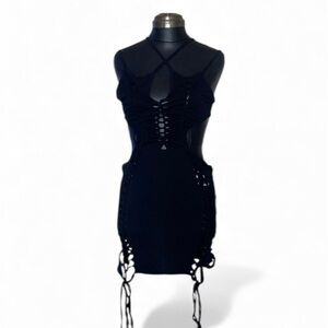 Chic black bodycon dress with lace-up details. Perfect for a night out.