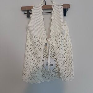 Crochet style, plunging neckline, tie fastening at bust, split hem