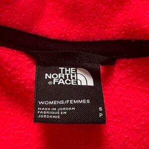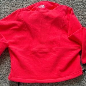 Vibrant pink fleece jacket by The North Face. Features a half-zip front and black trim.