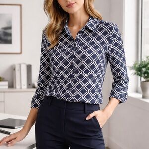 Banana Republic Dillon Classic Fit blouse in a timeless navy blue and white geometric lattice print. Lightweight and polished, this versatile button-down is perfect for office wear, business casual outfits, or chic minimalist styling. Classic collar, tailored silhouette, and flattering curved hem. Easy to dress up with trousers or style casually with denim.