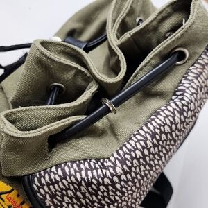 -Features a flap closure with adjustable drawstring -Large utility pockets on either side & front with snap button & faux buckle closures