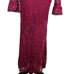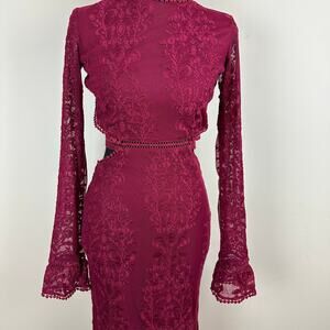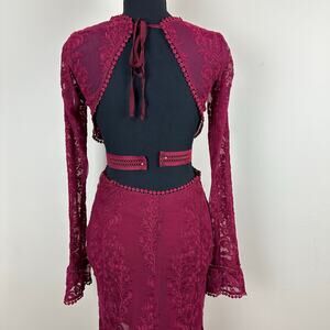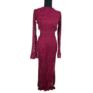 Burgundy Lace Open Back Flare Sleeve Slit Evening Gown Prom Gala Sultry Slinky Maxi Dress Size Small
