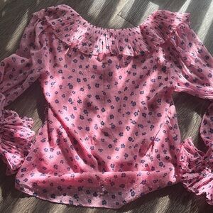 Chic pink blouse with blue floral pattern. Features elegant ruffles and Swiss dot details.