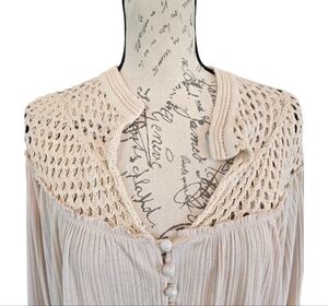 Gimmicks boho style creamy crochet macrame yoke henley peasant top. Ribbed knit split neck top with buttons, long sleeve balloon style sleeves with elasticized cuffs. Elastic hemline, raw edge details. Excellent used condition.
