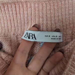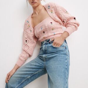 Chic pink knit sweater shrug and tube top set! Elegant open cable knit with embroidered colorful flower pattern. Perfect for springtime!