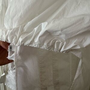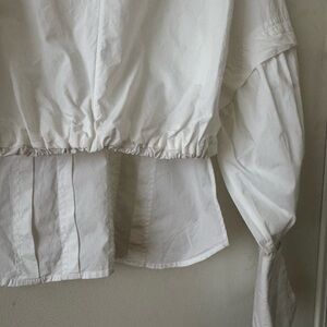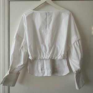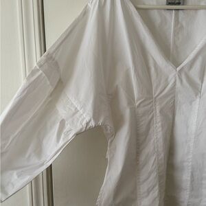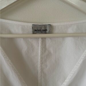 Rachel Comey white poplin v-neck blouse with puff sleeves, darted panels and a cropped, elasticized back. Pairs effortlessly with denim.